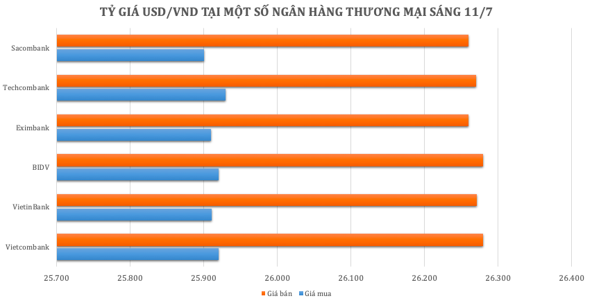 Ngân hàng Eximbank niêm yết USD ở mức 25.910 – 26.260 VND/USD, giảm 30 đồng ở chiều mua và bán so với phiên trước. Tại Techcombank, giá USD được điều chỉnh giảm 18 đồng, đang niêm yết ở mức 25.930 – 26.270 VND/USD. Sacombank niêm yết USD ở mức 25.900 – 26.260 VND/USD, giảm 30 đồng ở mỗi chiều so với phiên liền trước.