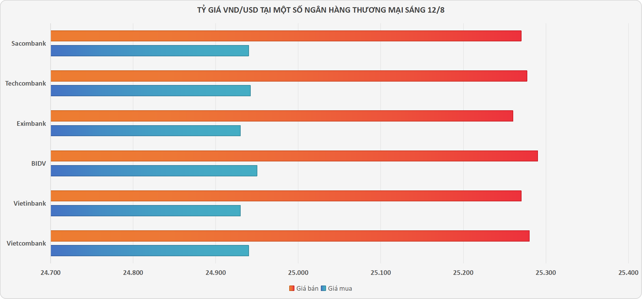 Techcombank đang niêm yết USD ở mức 24.942 - 25.277 VND/USD, giảm 46 đồng ở cả hai chiều mua bán so với phiên liền trước. Trong khi Sacombank đang niêm yết USD ở mức 24.940 - 25.270 VND/USD, giảm 30 đồng chiều mua và giảm 40 đồng ở chiều bán so với phiên khảo sát liền trước.