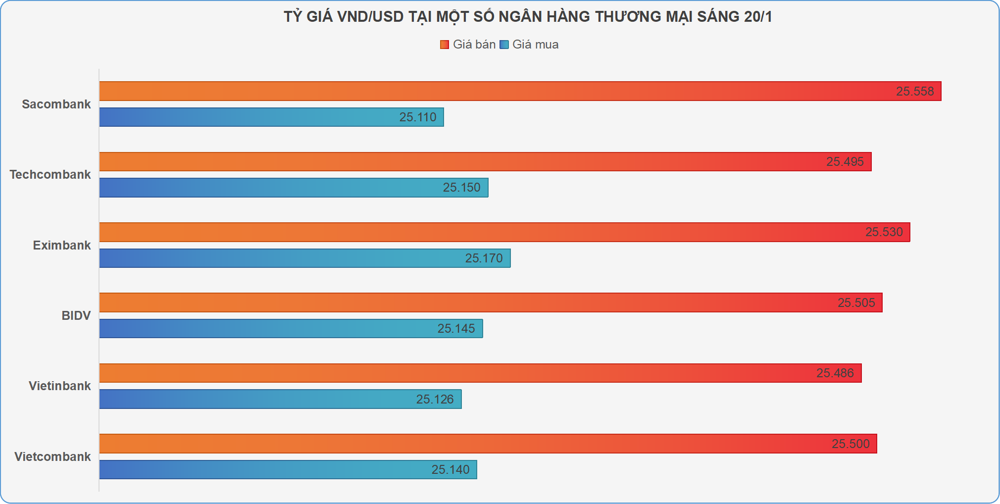 Eximbank giữ nguyên so với phiên trước, hiện đang niêm yết USD ở mức 25.170 - 25.530 VND/USD. Trong khi Techcombank giá USD điều chỉnh giảm 10 đồng ở chiều mua và 15 đồng ở chiều bán, đang niêm yết ở mức 25.150 - 25.495 VND/USD.