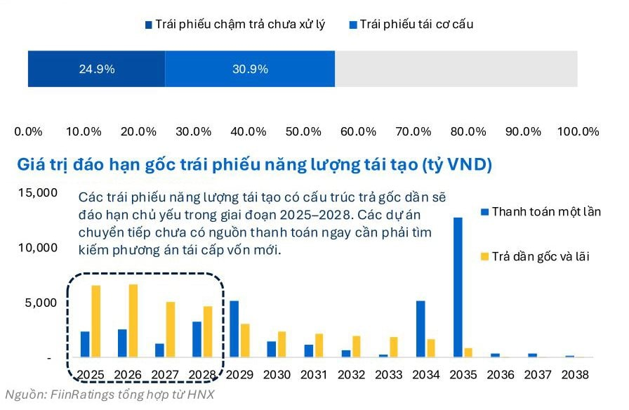 Dù không nêu rõ quy mô khối lượng của các trái phiếu do các doanh nghiệp năng lượng tái tạo phát hành bị vỡ nợ nhưng theo FiinRatings, trong 2 năm 2023-2024, trong tổng số các trái phiếu do đơn vị này thống kê có 24,9% lượng trái phiếu chậm trả chưa xử lý và 30,9% trái phiếu tái cơ cấu.