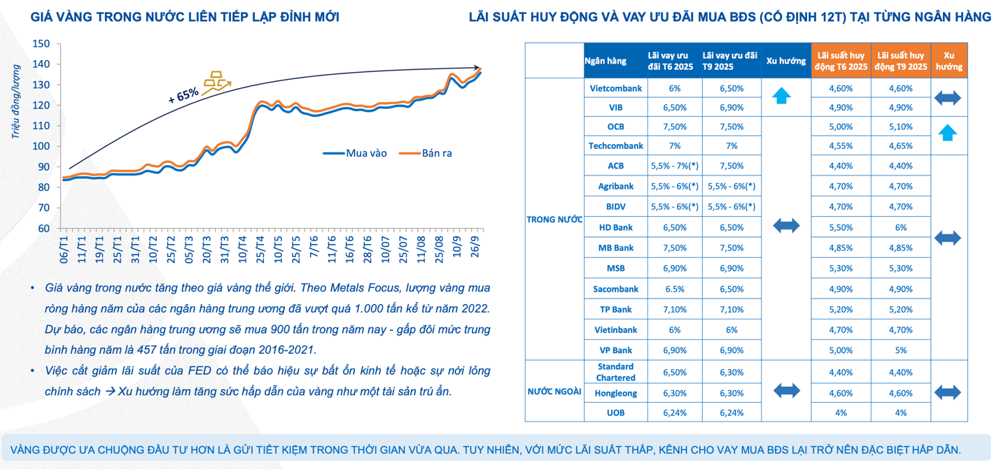 Trong khi đó, mặt bằng lãi suất VND giữ thấp và ổn định: lãi suất huy động 12 tháng phổ biến ~4,4–5,3%, còn lãi vay ưu đãi cố định 12 THÁNG cho người mua bất động sản ở nhiều ngân hàng duy trì quanh 6,0–7,5%. Sự tương phản này khiến dòng tiền hộ gia đình nghiêng về tài sản trú ẩn (vàng) thay vì gửi tiết kiệm, đồng thời kênh tín dụng nhà ở trở nên hấp dẫn hơn nhờ chi phí vốn giảm và các gói ưu đãi ổn định.