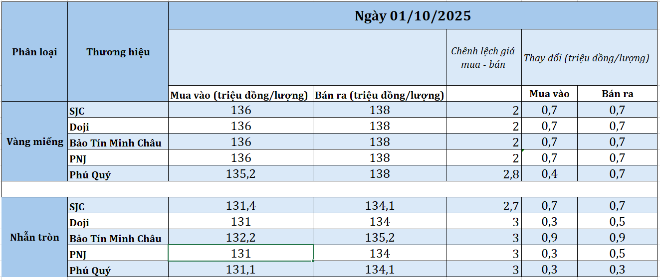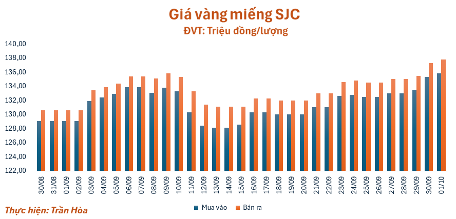 Đầu phiên giao dịch sáng nay (1/10), giá vàng miếng SJC tiếp tục tăng mạnh, lập đỉnh mới niêm yết ở mốc 136 – 138 triệu đồng/lượng, tăng 0,7 triệu đồng/lượng ở cả chiều mua và bán ra so với giá khảo sát sáng qua. Chênh lệch giá mua vào - bán ra ở ngưỡng 2 triệu đồng/lượng.