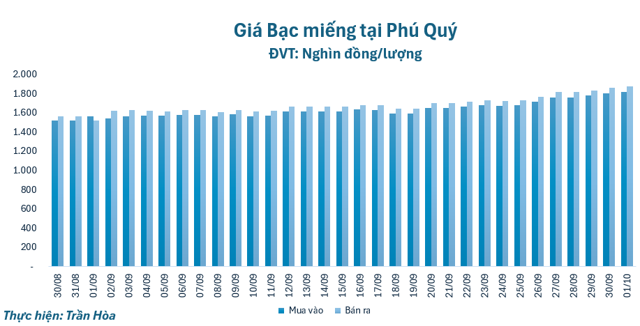 Giá bạc sáng 1/10 được điều chỉnh tăng nhẹ so với giá khảo sát sáng qua. Tại Phú Quý, giá bạc tăng 17.000 đồng ở chiều mua và chiều bán, đạt mốc 1.822.000 – 1.878.000 đồng/lượng. Giá bạc thỏi 1kg cũng đã vượt ngưỡng 50 triệu đồng, hiện đang quanh mốc 50.079.875 đồng/kg.