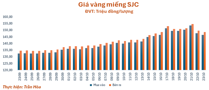 Phiên giao dịch sáng nay (23/10), lúc 10 giờ 00 phút giá vàng miếng SJC niêm yết ở mốc 146,6 – 148,6 triệu đồng/lượng (mua – bán), giảm 1,2 triệu đồng/lượng ở cả chiều mua và chiều bán so với giá khảo sát chiều qua. Chênh lệch giá mua vào - bán ra ở mốc 2 triệu đồng/lượng.