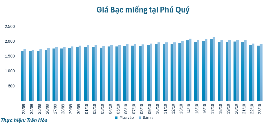 Giá bạc sáng 23/10 cũng giảm theo đà giảm của giá vàng, tại Phú Quý, giá bạc giảm 11.000 đồng ở chiều mua và giảm 12.000 đồng chiều bán so với giá khảo sát chiều qua, đạt mốc 1.859.000 – 1.916.000 đồng/lượng.