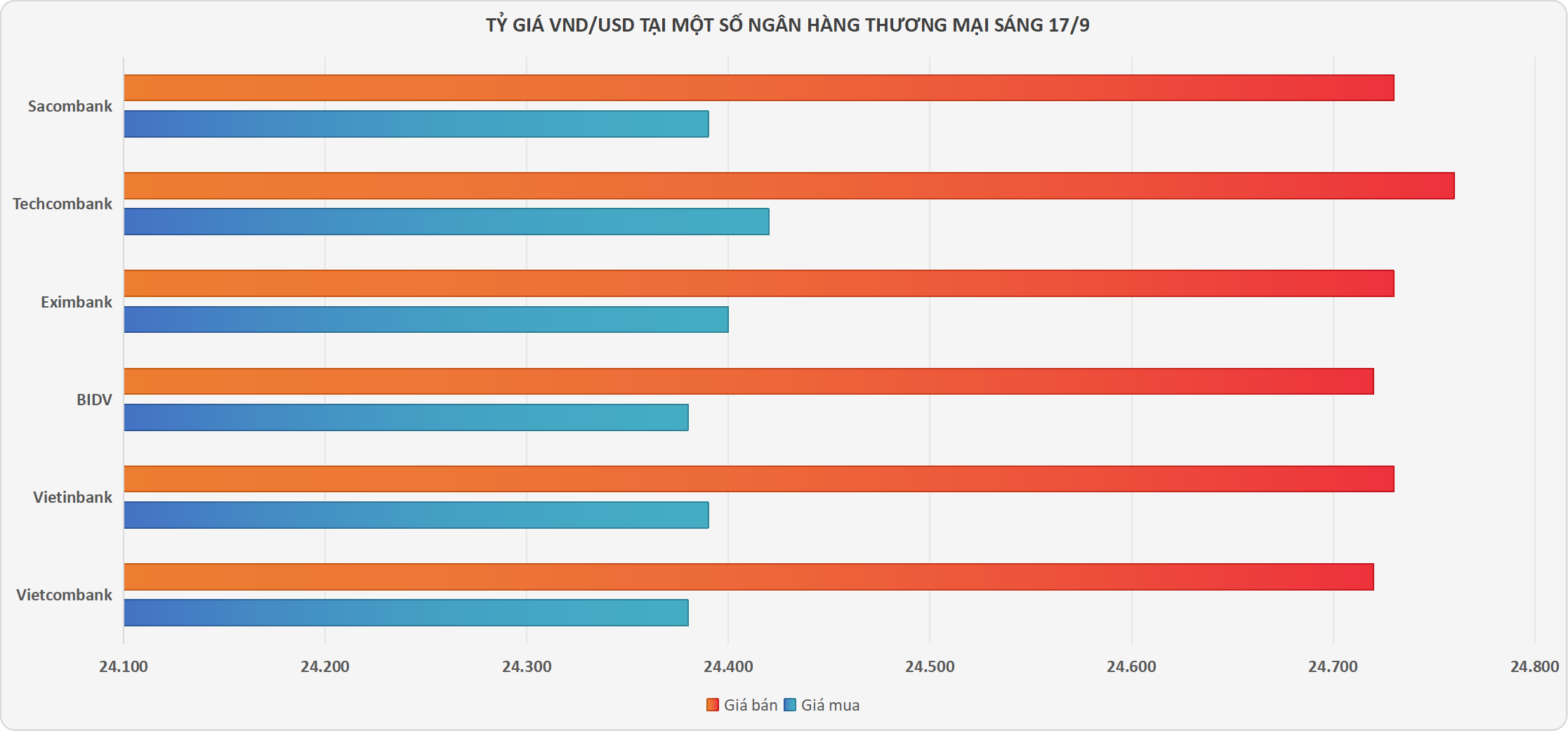 Trong khi đó, Sacombank đang niêm yết USD ở mức 24.390 - 24.730 VND/USD, giữ nguyên chiều mua và giảm 10 đồng ở chiều bán.
