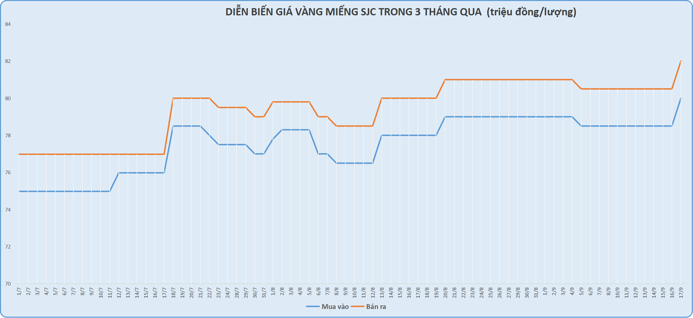 Tại Bảo Tín Minh Châu và PNJ giá mua bán vàng miếng SJC cũng đang niêm yết ở mức 80- 82 triệu đồng/lượng, tăng 1,5 triệu đồng ở cả hai chiều mua vào - bán ra so với phiên trước đó.
