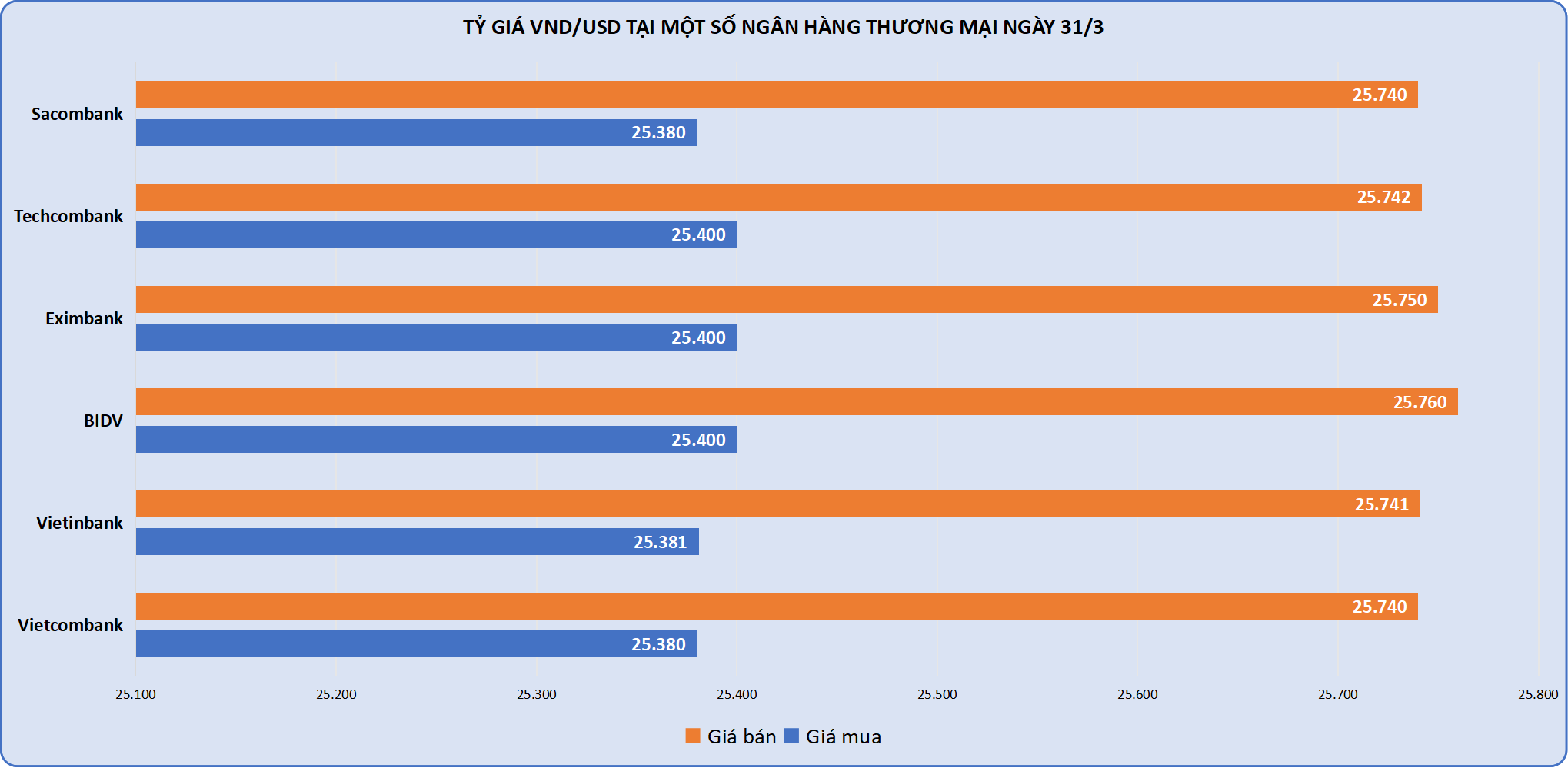 Tại Techcombank, giá USD điều chỉnh giảm 6 đồng ở mỗi chiều, đang niêm yết ở mức 25.400 - 25.742 VND/USD. Trong khi Sacombank niêm yết USD ở mức 25.380 - 25.740 VND/USD, giảm 12 đồng ở cả hai chiều mua và bán so với phiên trước đó.