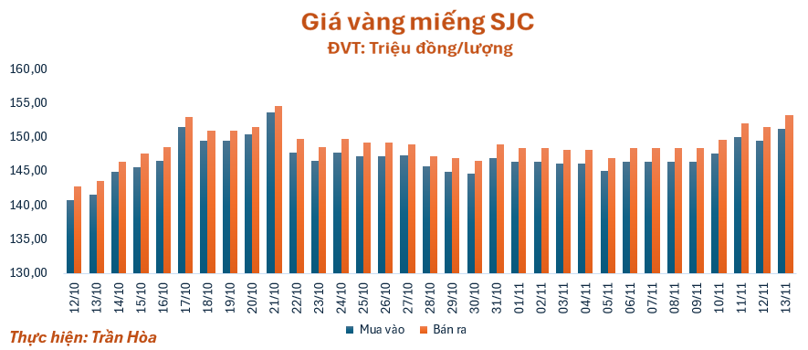 Phiên giao dịch sáng hôm nay (13/11), giá vàng tăng mạnh so với giá khảo sát chiều qua, quanh mốc 151,3 – 153,3 triệu đồng/lượng (mua – bán), tăng 1,8 triệu đồng/lượng ở cả hai chiều. Chênh lệch giá mua vào - bán ra ở ngưỡng 2 triệu đồng/lượng.