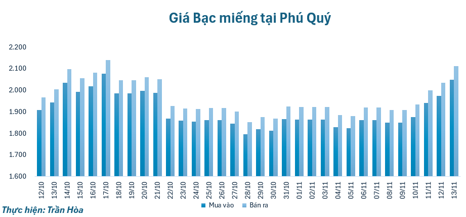 Giá bạc sáng 13/11 được điều chỉnh tăng mạnh so với giá khảo sát chiều qua, tại Phú Quý, giá bạc miếng niêm yết ở mốc 2.049.000 – 2.112.000 đồng/lượng, tăng 74.000 đồng ở chiều mua và tăng 76.000 đồng ở chiều bán.