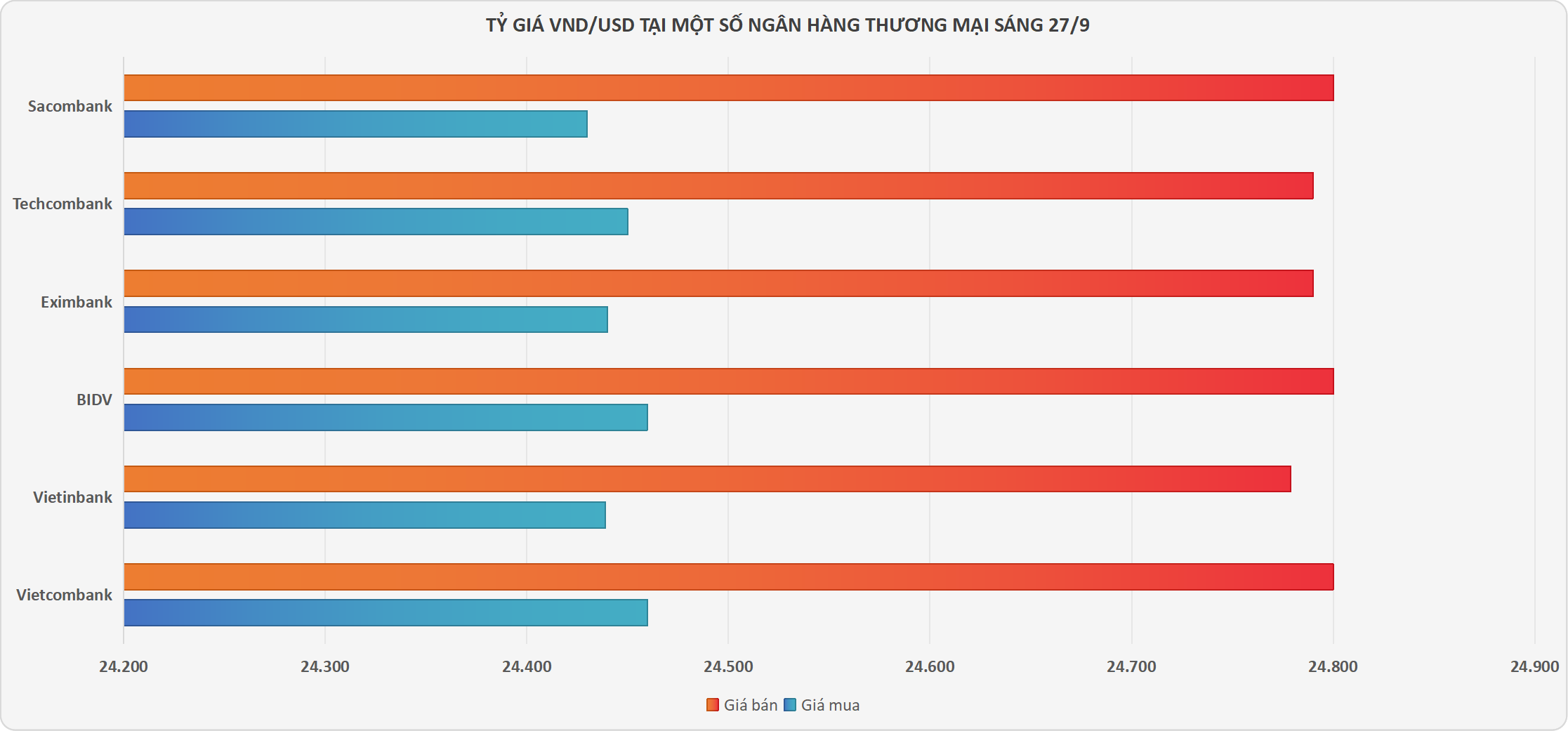 Tại Techcombank giá USD giảm 10 đồng ở cả hai chiều mua - bán , đang niêm yết ở mức 24.450 - 24.790 VND/USD. Sacombank đang niêm yết USD ở mức 24.430 - 24.800 VND/USD, giảm 10 đồng ở hai chiều mua và chiều bán không đổi so với phiên liền trước.