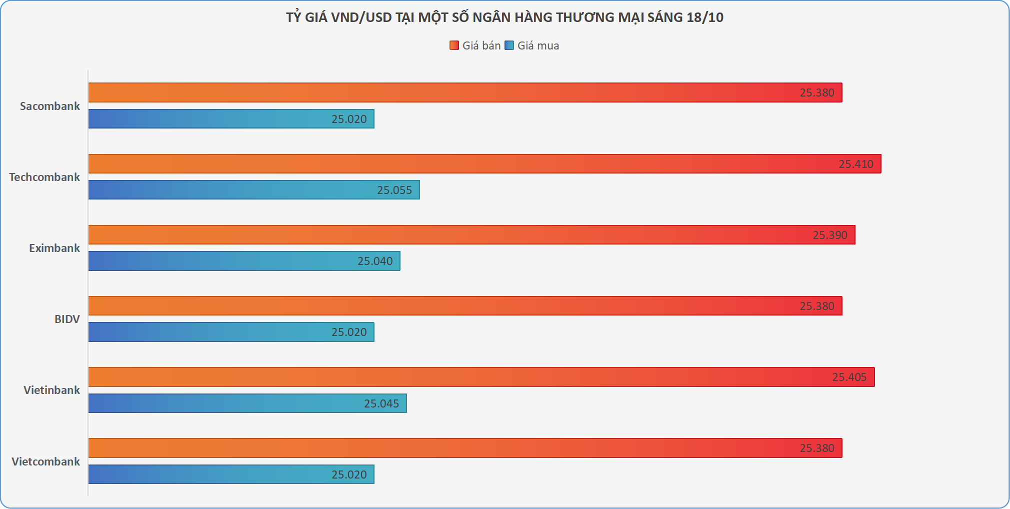 Ngân hàng BIDV giá USD tăng 200 đồng ở cả hai chiều mua - bán, đang niêm yết ở mức 25.020 - 25.380 VND/USD. Eximbank đang niêm yết USD ở mức 25.040 - 25.390 VND/USD, tăng 160 đồng ở chiều mua và 180 đồng ở chiều bán so với phiên liền trước.