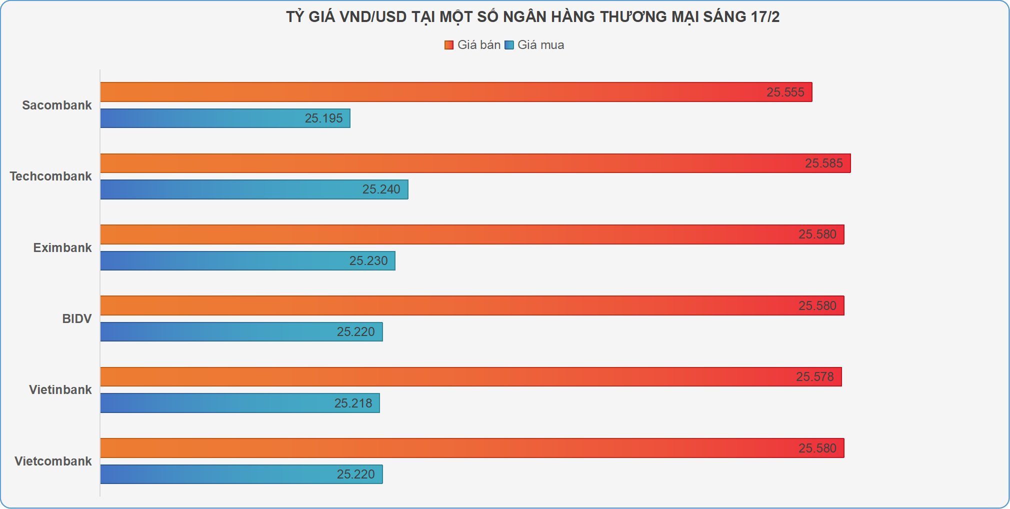 Eximbank giá USD tăng 10 đồng ở hai chiều mua và bán so với phiên trước, hiện đang niêm yết USD ở mức 25.230 - 25.580 VND/USD. Trong khi tại Techcombank, giá USD điều chỉnh tăng 15 đồng, đang niêm yết ở mức 25.240 - 25.585 VND/USD.