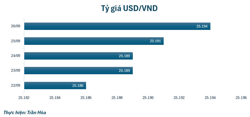 Tỷ giá USD tuần qua tăng 8 đồng so với phiên cuối tuần trước, đang được niêm yết ở mốc 25.194 VND/USD. Tại một số ngân hàng thương mại, giá USD cũng tăng theo tỷ giá trung tâm.