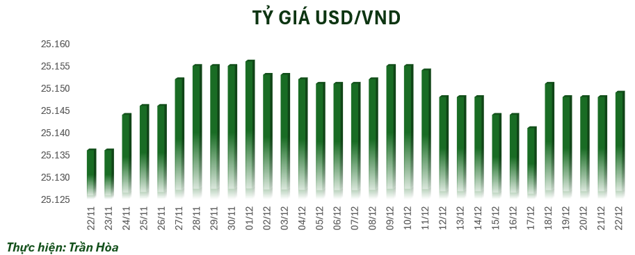 Tỷ giá USD tăng nhẹ, niêm yết ở mốc 25.149 VND/USD, tăng 1 đồng so với chốt phiên tuần trước. Tại một số ngân hàng thương mại, giá USD cũng được điều chỉnh tăng 1 đồng ở chiều bán theo tỷ giá trung tâm.