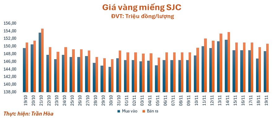 Phiên giao dịch sáng nay (19/11), giá vàng miếng SJC tăng 0,9 triệu đồng/lượng so với giá khảo sát sáng qua, quanh mốc 148,7 – 150,7 triệu đồng/lượng (mua – bán). Chênh lệch giá mua vào - bán ra ở ngưỡng 2 triệu đồng/lượng.
