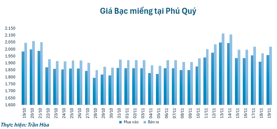 Giá bạc sáng 19/11 được điều chỉnh tăng, tại Phú Quý, giá bạc miếng niêm yết ở mốc 1.958.000 – 2.019.000 đồng/lượng, tăng 46.000 đồng ở chiều mua và tăng 48.000 đồng chiều bán so với cùng thời điểm ngày hôm qua.