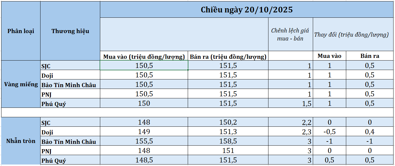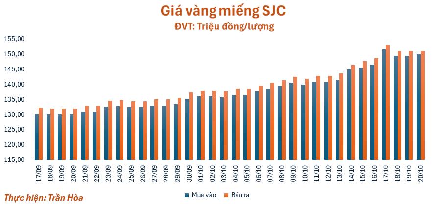 Phiên giao dịch chiều nay (20/10), lúc 16 giờ 20 phút giá vàng miếng SJC tiếp tục tăng, niêm yết ở mức 150,5 – 151,5 triệu đồng/lượng (mua – bán), tăng 1 triệu đồng/lượng ở chiều mua và tăng 0,5 triệu đồng/lượng ở chiều bán so với giá đóng cửa tuần trước. Chênh lệch giá mua vào - bán ra rút ngắn còn 1 triệu đồng/lượng.