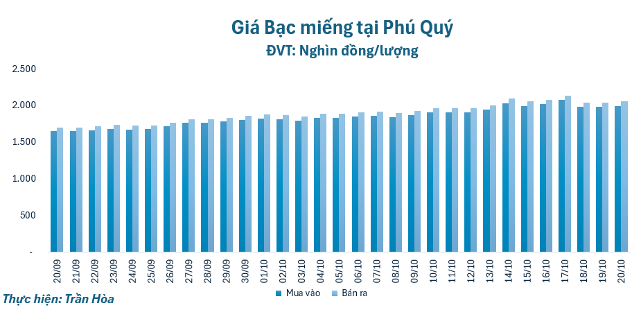 Giá bạc chiều 20/10 vẫn tiếp tục duy trì đà tăng của tuần trước, tại Phú Quý, giá bạc tăng 13.000 đồng ở chiều mua và tăng 14.000 đồng chiều bán so với giá đóng cửa phiên cuối tuần trước, đạt mốc 1.998.000 – 2.060.000 đồng/lượng. Giá bạc thỏi 1kg cũng tiếp tục tăng hơn 400.000 đồng ở cả hai chiều mua - bán, niêm yết ở mức 53.279.867 – 54.933.196 đồng (mua – bán).