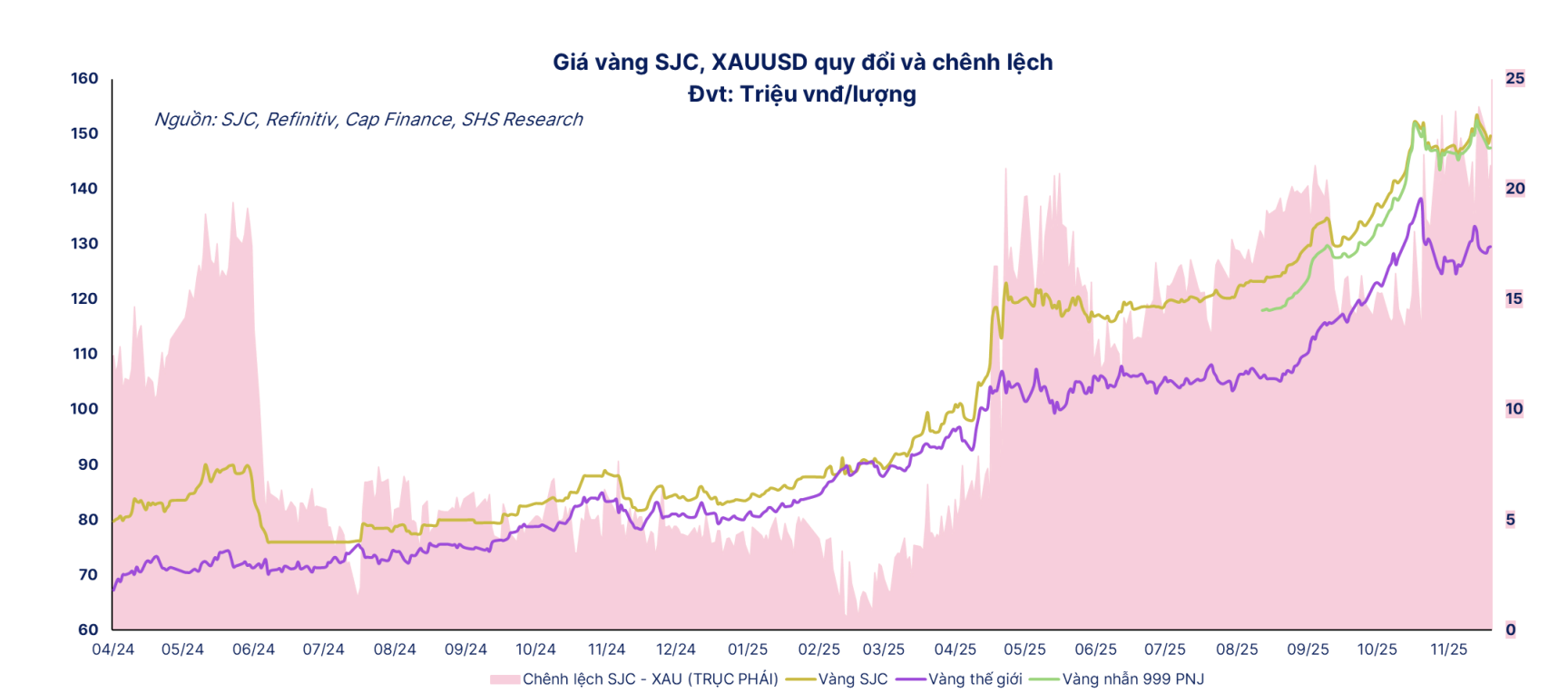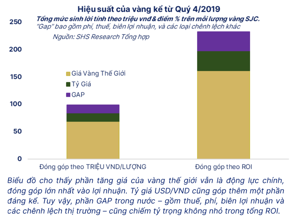 Theo chuyên gia SHS Research, giá vàng trong nước về cơ bản được quyết định bởi giá vàng quốc tế quy đổi cộng với một phần chênh lệch nội địa (thường gọi là GAP). Vì nguồn cung vàng Việt Nam chủ yếu đến từ nhập khẩu mà cung khai thác nội địa rất ít.