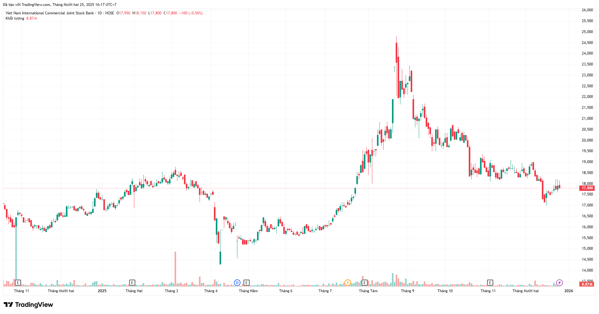 Kết thúc phiên giao dịch ngày 25/12, giá cổ phiếu VIB ở mức 17.800 đồng/cổ phiếu, tăng khoảng 3,49% so với đầu năm