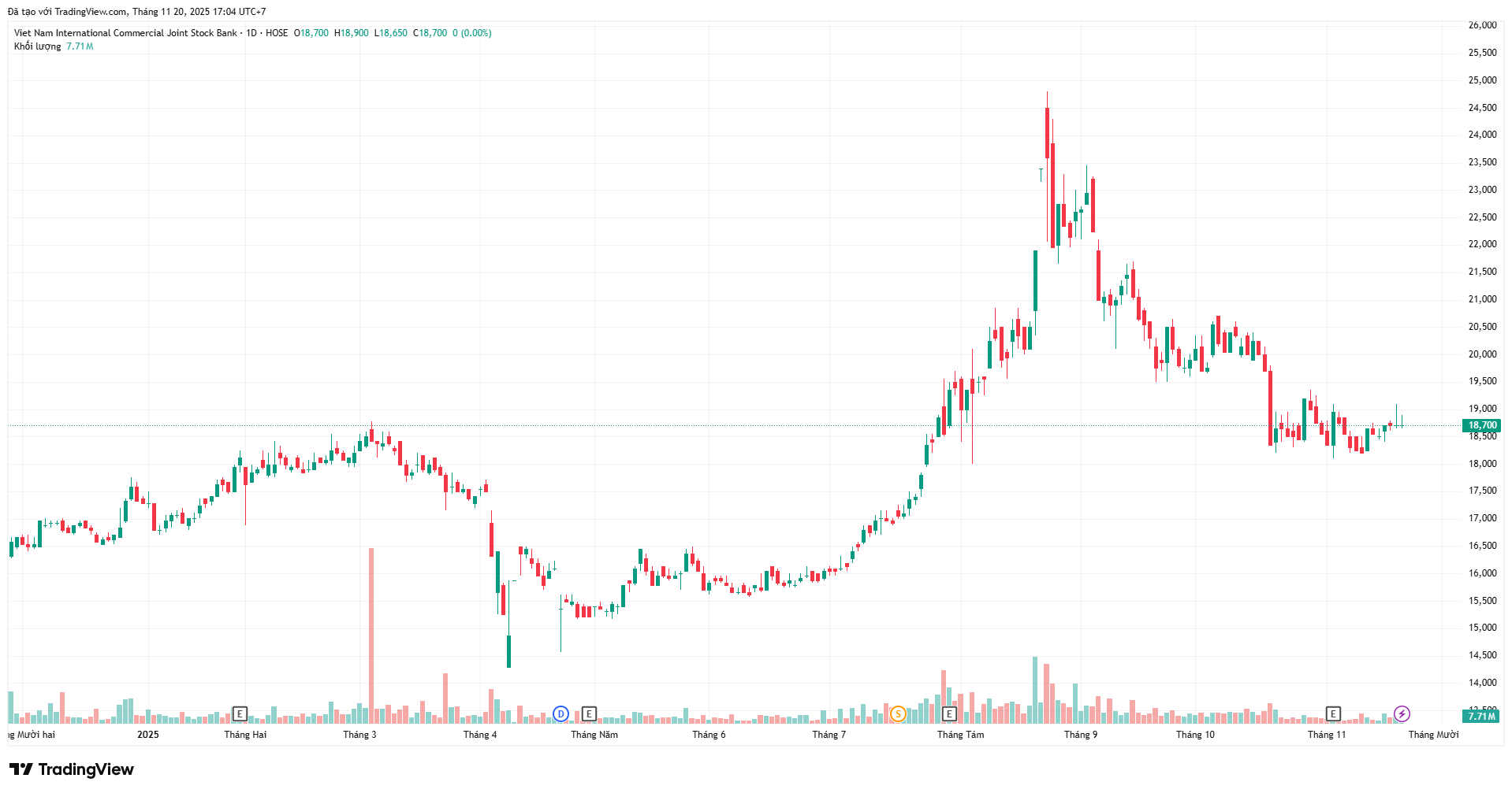 Kết thúc phiên giao dịch ngày 20/11, giá cổ phiếu VIB ở mức 18.700 đồng/cổ phiếu, tăng khoảng 12,5% so với đầu năm.