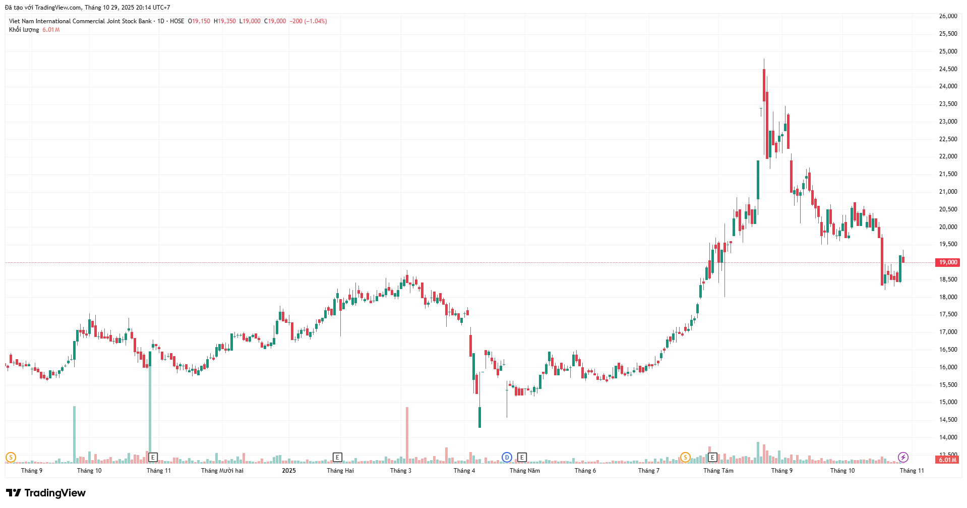 Kết thúc phiên giao dịch ngày 29/10, giá cổ phiếu VIB ở mức 19.000 đồng/cổ phiếu, tăng khoảng 12,52% so với đầu năm.