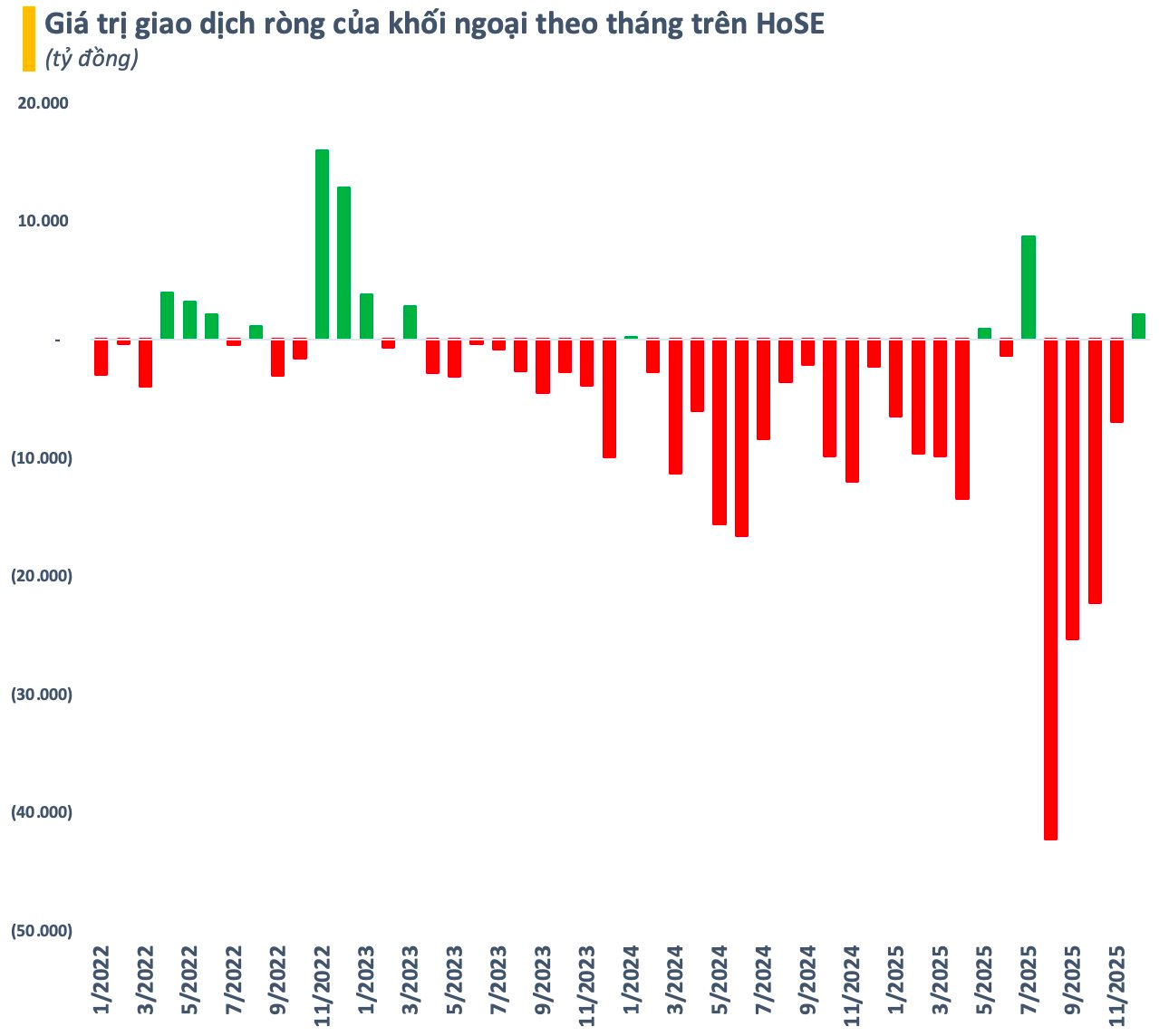 Đáng chú ý, khối ngoại đã mua ròng trở lại. Mặc dù giá trị không lớn chỉ gần 2.100 tỷ trên HoSE nhưng đây vẫn là một tín hiệu tích cực với chứng khoán Việt Nam sau giai đoạn bán ròng triền miên trước đó. Xu hướng này đang được duy trì trong những ngày đầu năm 2026, mở ra kỳ vọng dòng vốn ngoại thực sự đảo chiều.