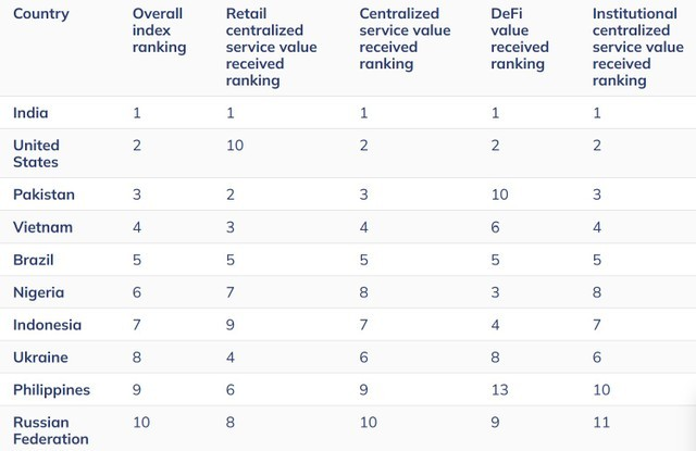 Năm nay, Ấn Độ là quốc gia dẫn đầu trong bảng xếp hạng, tiếp theo là Mỹ, Pakistan, Việt Nam và Brazil. Đây là năm thứ 5 liên tục Việt Nam được ghi nhận trong top 5 quốc gia có tỷ lệ tiếp nhận cao nhất kể từ lần đầu xuất hiện trong báo cáo “Chỉ số Chấp nhận Crypto Toàn cầu” vào năm 2021.