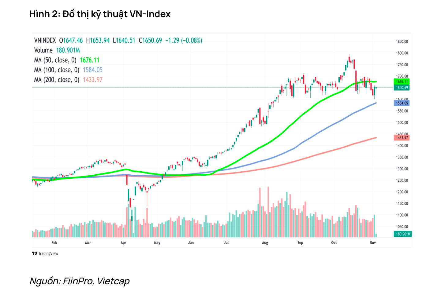 Sau nhịp giảm nhanh và mạnh trong trung tuần tháng 10 từ đỉnh 1.795 điểm, VN-Index đang có xu hướng đi ngang và tích lũy trong vùng 1.620–1.690 điểm (+/-10 điểm) trong những phiên cuối tháng 10 và đầu tháng 11. Diễn biến này cho thấy thị trường bước vào giai đoạn ổn định trở lại sau biến động mạnh, khi lực cầu và lực cung đang dần cân bằng.