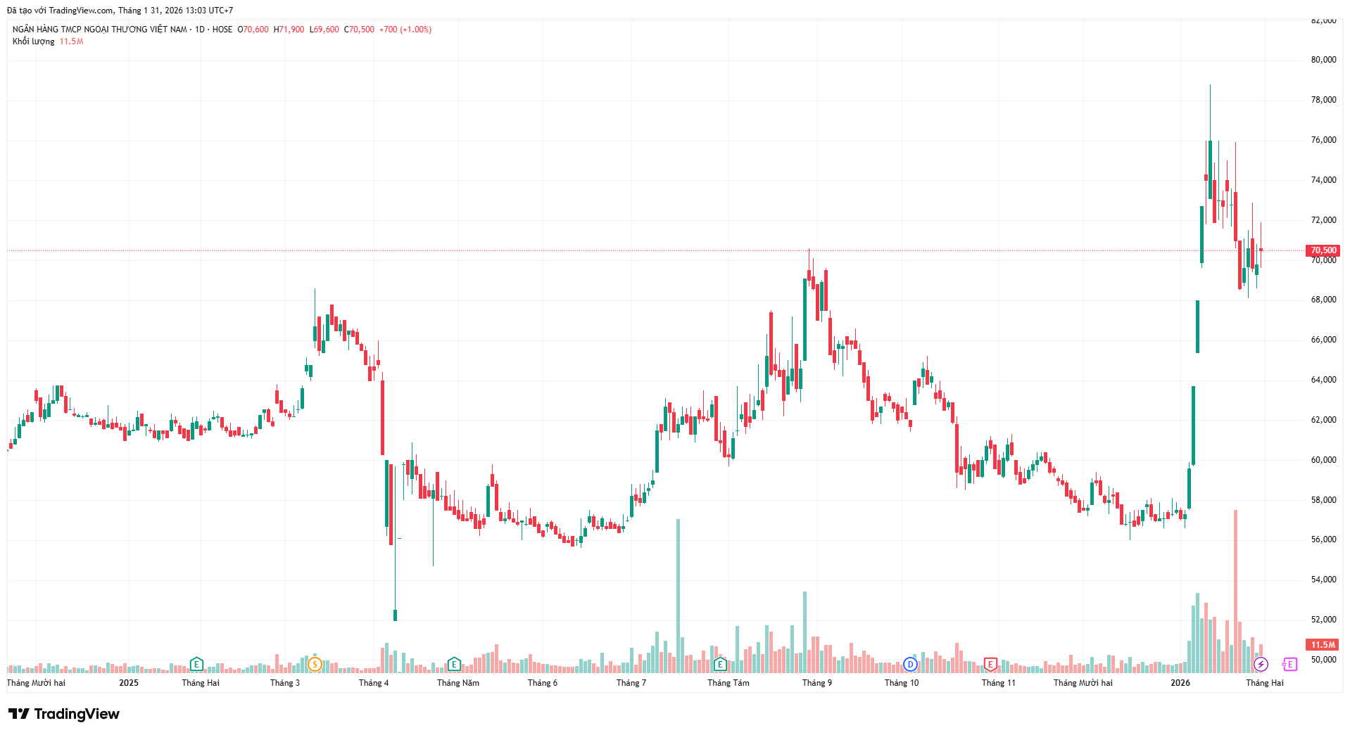 Kết thúc phiên giao dịch ngày 30/1, giá cổ phiếu VCB của Vietcombank ở mức 70.500 đồng/cổ phiếu, tăng gần 23,47% so với đầu năm.