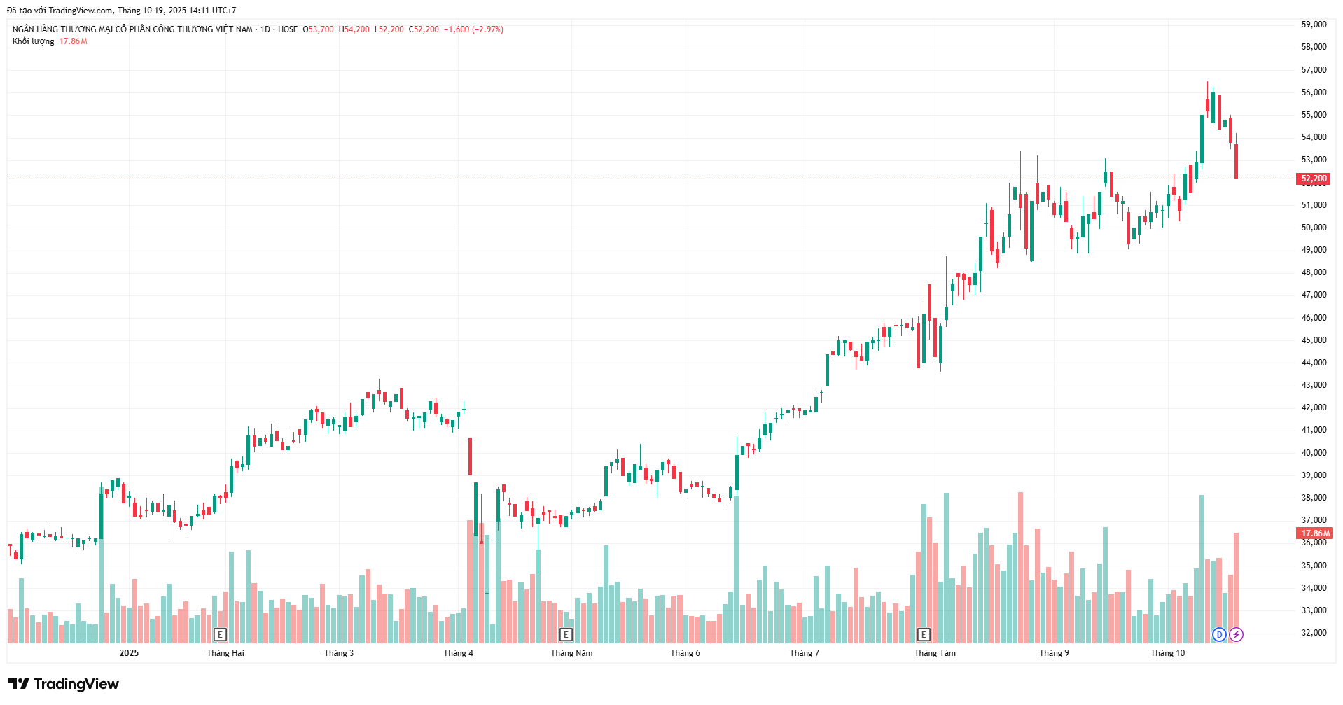 Đóng cửa phiên giao dịch cuối tuần (17/10), giá cổ phiếu CTG của Vietinbank ở mức 52.200 đồng/cp, tăng 37,37% từ đầu năm.