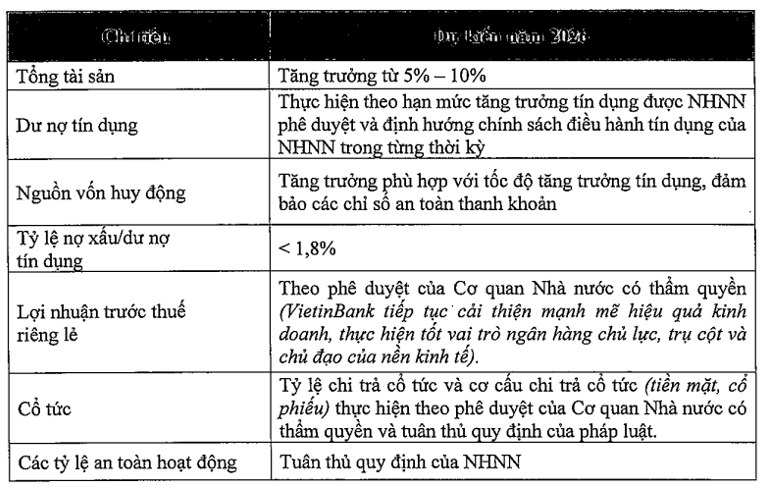Theo kế hoạch, năm 2026, VietinBank đặt mục tiêu tăng trưởng tổng tài sản từ 5–10% so với năm trước. Dư nợ tín dụng tăng theo hạn mức được Ngân hàng Nhà nước phê duyệt, trong khi nguồn vốn huy động được điều chỉnh phù hợp với tốc độ tăng tín dụng. Tỷ lệ nợ xấu được kiểm soát dưới 1,8%.