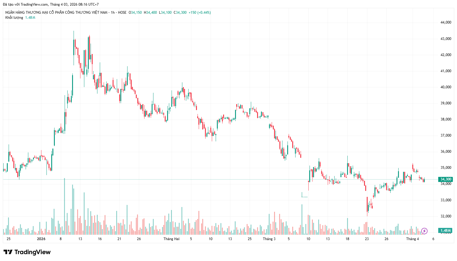 Kết thúc phiên giao dịch ngày 2/4, giá cổ phiếu CTG ở mức 34.300 đồng/cổ phiếu, giảm khoảng 4% so với đầu năm 2026.