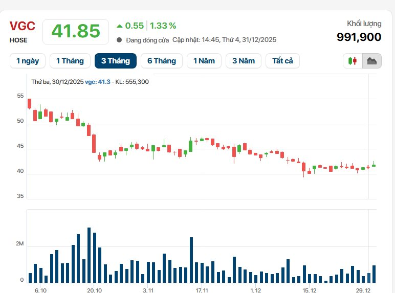 Trên thị trường chứng khoán, kết thúc phiên giao dịch ngày 31/12/2025, cổ phiếu VGC đóng cửa tại mức giá 41.850 đồng/cp, tăng 1,33 %, khối lượng giao địch gần 1 triệu cổ phiếu.