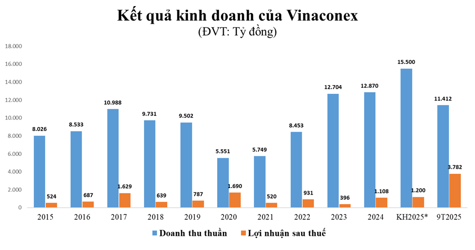 Kết quả kinh doanh quý III cũng tác động lớn đến kết quả lũy kế 9 tháng của Vinaconex với doanh thu thuần đạt 11.412 tỷ đồng, tăng 40,2% so với cùng kỳ; lợi nhuận sau thuế đạt 3.782 tỷ đồng, tăng gần 400% so với 9 tháng năm 2024.