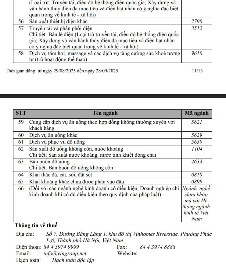 Sau thay đổi, Vingroup có 66 ngành. Các ngành được bổ sung gồm:
