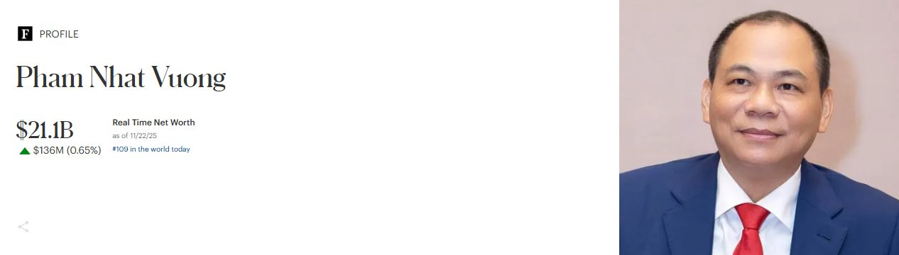 Cụ thể, theo thống kê mới nhất từ Forbes, tỷ phú Phạm Nhật Vượng sở hữu khối tài sản ròng lên tới 21,1 tỷ USD, xếp thứ 109 thế giới. Đây là thứ hạng cao nhất mà một doanh nhân Việt Nam từng đạt được. Hiện nay, người đứng đầu Tập đoàn Vingroup chỉ còn cách top 100 tỷ phú giàu nhất thế giới khoảng 1,2 tỷ USD tài sản. Với khối tài sản trên còn giúp tỷ phú Phạm Nhật Vượng vượt qua tỷ phú Eri Li (19,8 tỷ USD), Chủ tịch Geely Holding Group, một trong những tập đoàn ô tô lớn nhất Trung Quốc.