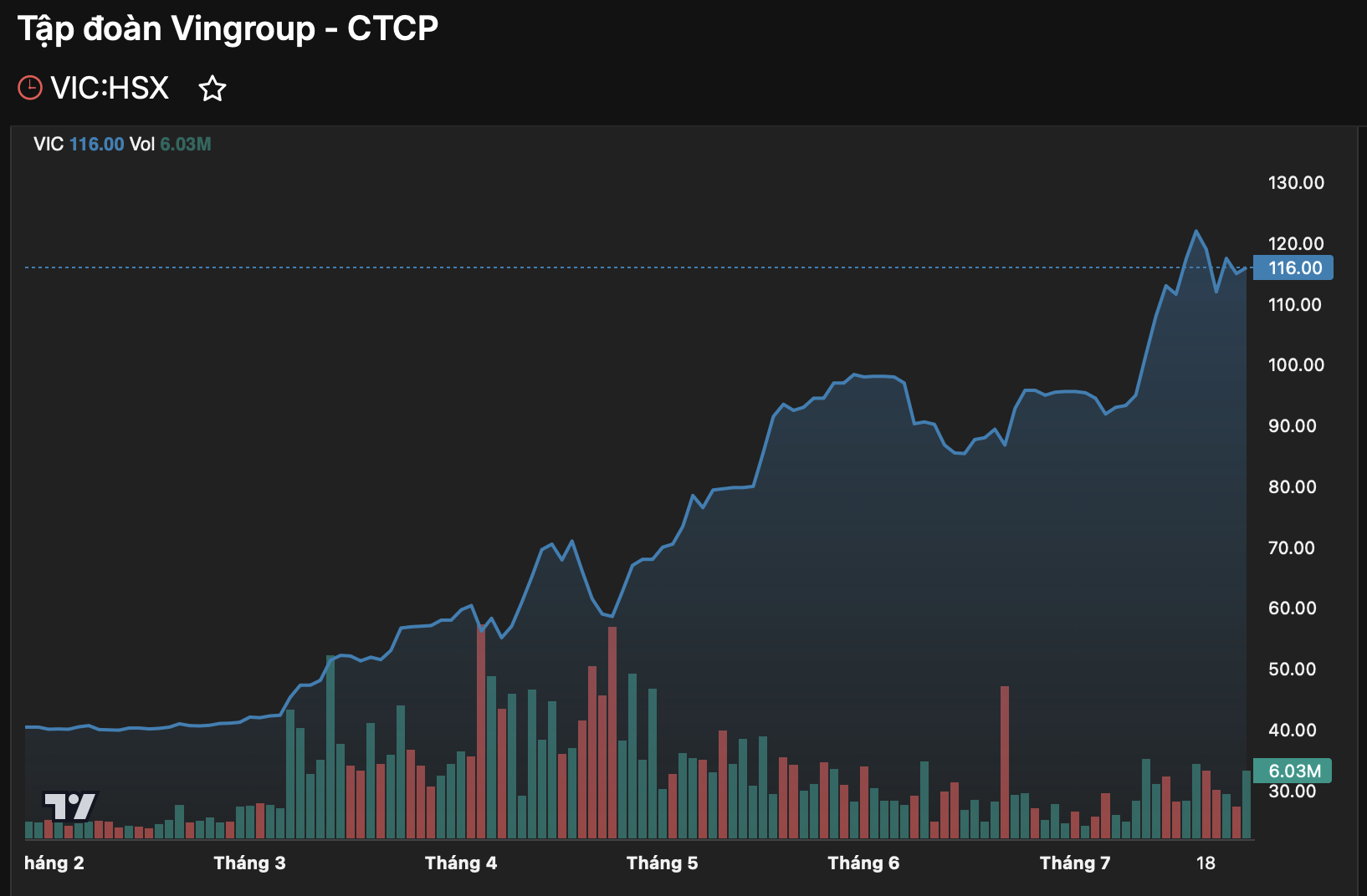 Trên sàn chứng khoán, cổ phiếu VIC đang ở gần vùng đỉnh lịch sử với thị giá 116.000 đồng/cp, gấp gần 3 lần hồi đầu năm. Vốn hóa thị trường của Vingroup tương ứng đạt gần 450.000 tỷ đồng, xếp thứ 2 toàn thị trường, chỉ sau duy nhất Vietcombank (VCB).