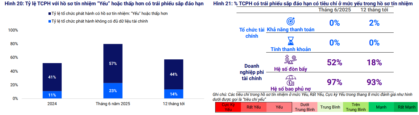 Trong 12 tháng tới, VIS Rating ước tính có khoảng 222.000 tỷ đồng trái phiếu sẽ đáo hạn. Trong số này, 44% được phát hành bởi các tổ chức phát hành có hồ sơ tín nhiệm ở mức “yếu” hoặc thấp hơn.