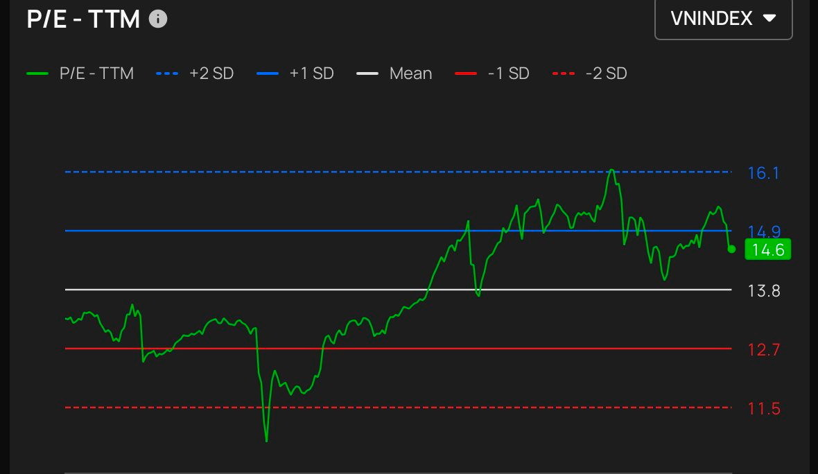 Hiện tại, VN-Index đã giảm 6,4% so với đỉnh, P/E đạt mức 14,76 lần và P/B 2,04 lần, cao hơn nhẹ so với mức trung bình 5 năm. Theo đánh giá của chuyên gia Agriseco, xét trên bình diện chung, thị trường chưa thực sự bước vào vùng định giá “rẻ”. Tuy nhiên, nhịp điều chỉnh vừa qua đã tạo ra sự phân hóa rõ nét giữa các nhóm ngành.