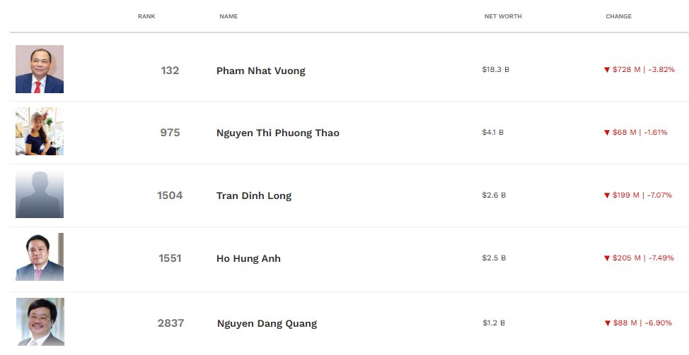 Với mức giảm 728 triệu USD, tỷ phú Phạm Nhật Vượng là tỷ phú có tài sản giảm mạnh nhất thế giới trong ngày hôm nay theo Forbes.