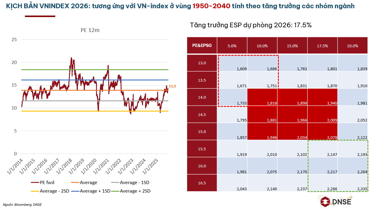 Còn TS. Hồ Sỹ Hòa đưa ra dự báo tăng trưởng EPS có thể đạt 17,5% trong năm 2025. Với đinh giá PE 14-15 lần, VN-Index có thể tăng lên 1.950-2.040 điểm.