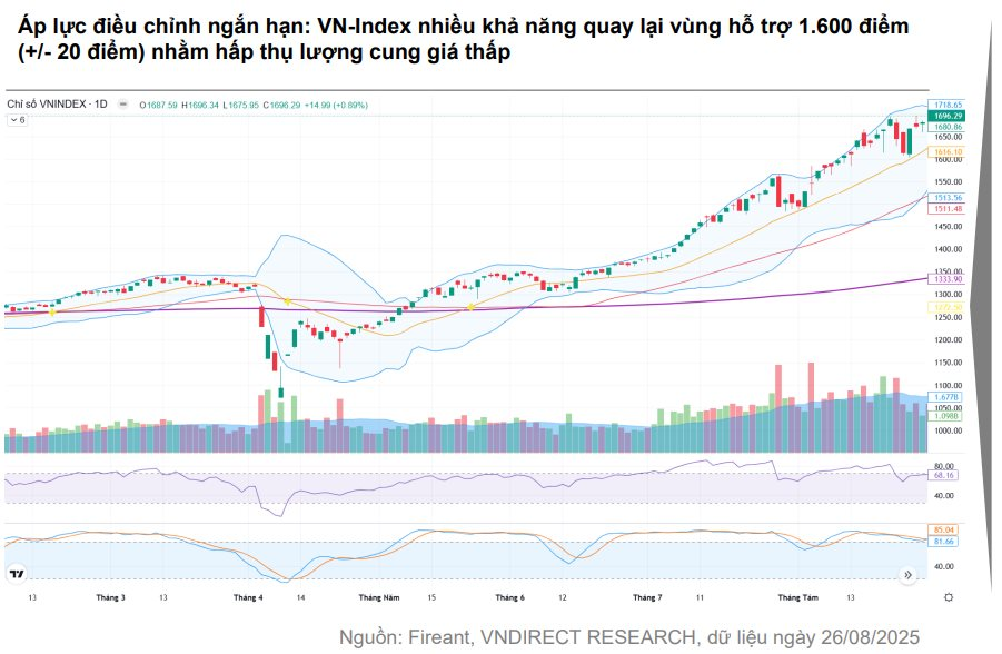 Chỉ số có thể kiểm định lại vùng 1.600 điểm (+/-20 điểm) để hấp thụ lực cung giá thấp, trước khi hướng tới thử thách lại ngưỡng kháng cự 1.700 điểm trong quý 4. Do đó VNDirect khuyến nghị nhà đầu tư duy trì tỷ trọng ở các cổ phiếu cơ bản tốt còn tiềm năng tăng giá. Việc quản trị rủi ro cần được ưu tiên thông qua tái cân bằng danh mục và kiểm soát chặt chẽ tỷ lệ sử dụng đòn bẩy tài chính.