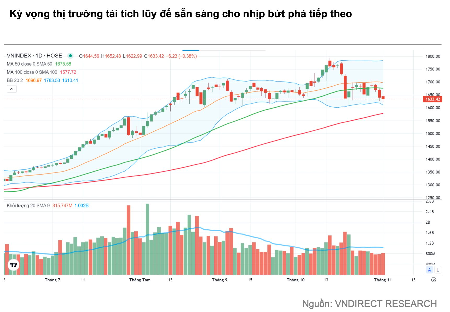 Trong kịch bản cơ sở, VN-Index được kỳ vọng sẽ điều chỉnh và dao động tích lũy trong 1–2 tháng tới trước khi quay trở lại xu hướng tăng. Chỉ số có thể kiểm định lại vùng 1.600 điểm (±20 điểm) để hấp thụ nguồn cung giá thấp, trước khi hướng tới ngưỡng kháng cự 1.720 điểm trong quý I/2026.