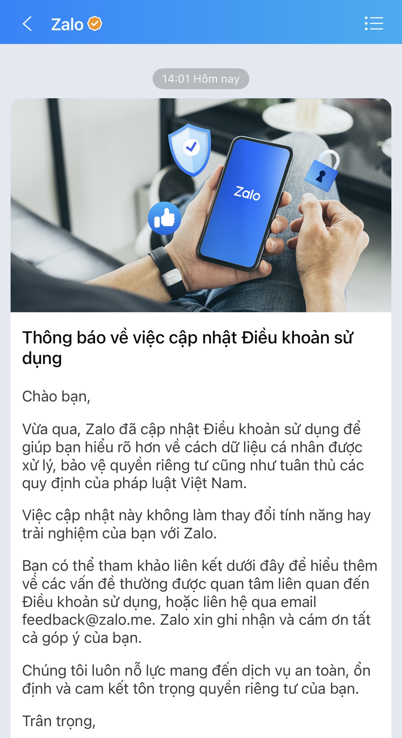 Thứ ba, có biện pháp bảo vệ thông tin và tạm thời không chuyển giao giao dịch thứ ba đối với những người dùng đã chấp nhận Thỏa thuận sử dụng dịch vụ Zalo mới được cập nhật.