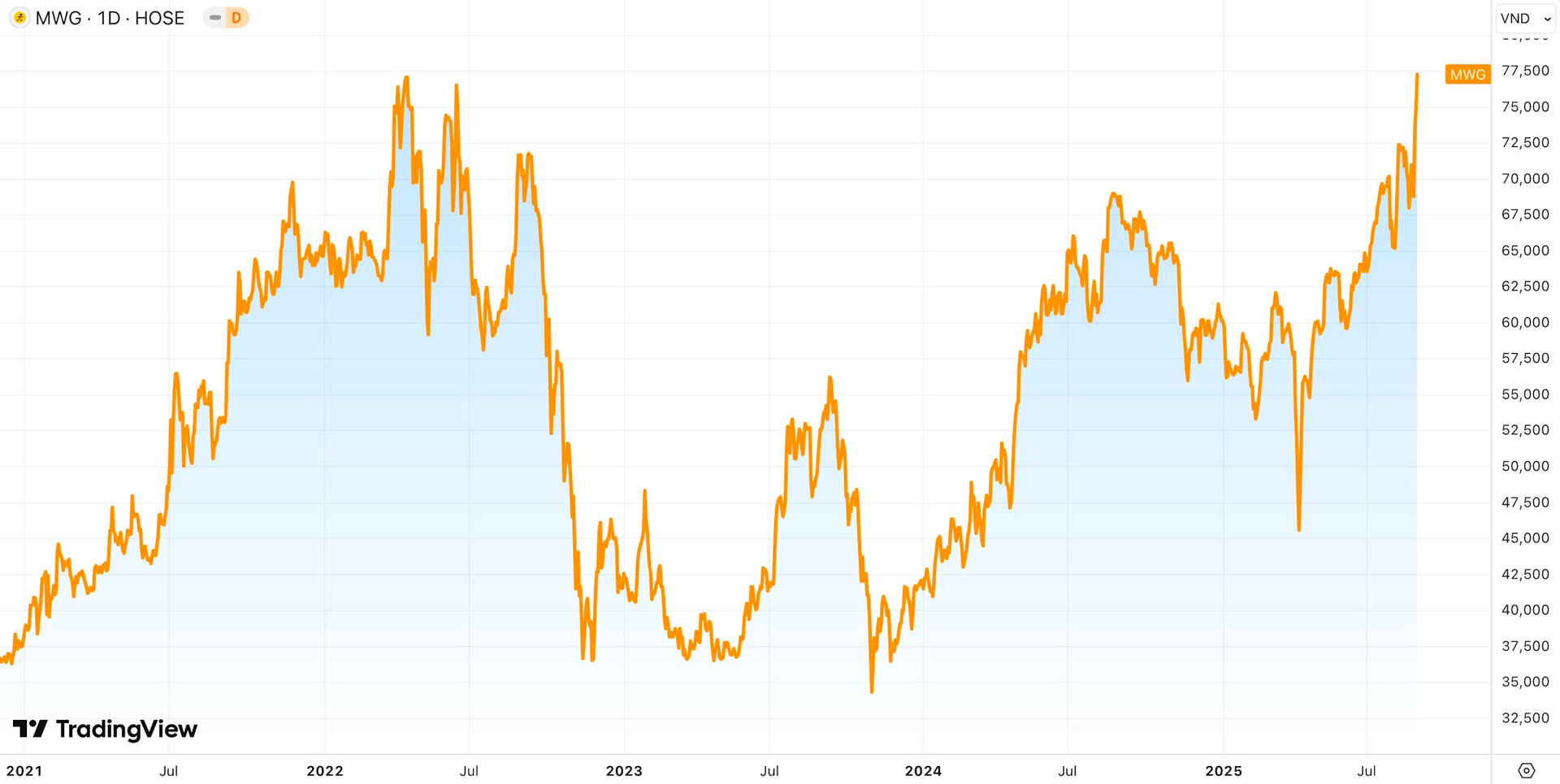 Sau 3 phiên tăng mạnh liên tiếp, cổ phiếu MWG của CTCP Đầu tư Thế Giới Di Động đã leo lên lập đỉnh mới với thị giá 77.300 đồng/cp. Tính từ đầu tháng 7 đến nay, MWG đã tăng hơn 20% thị giá, qua đó đẩy vốn hóa thị trường lập kỷ lục hơn 114.000 tỷ đồng. Đà tăng của cổ phiếu được hỗ trợ bởi tình hình kinh doanh khởi sắc.