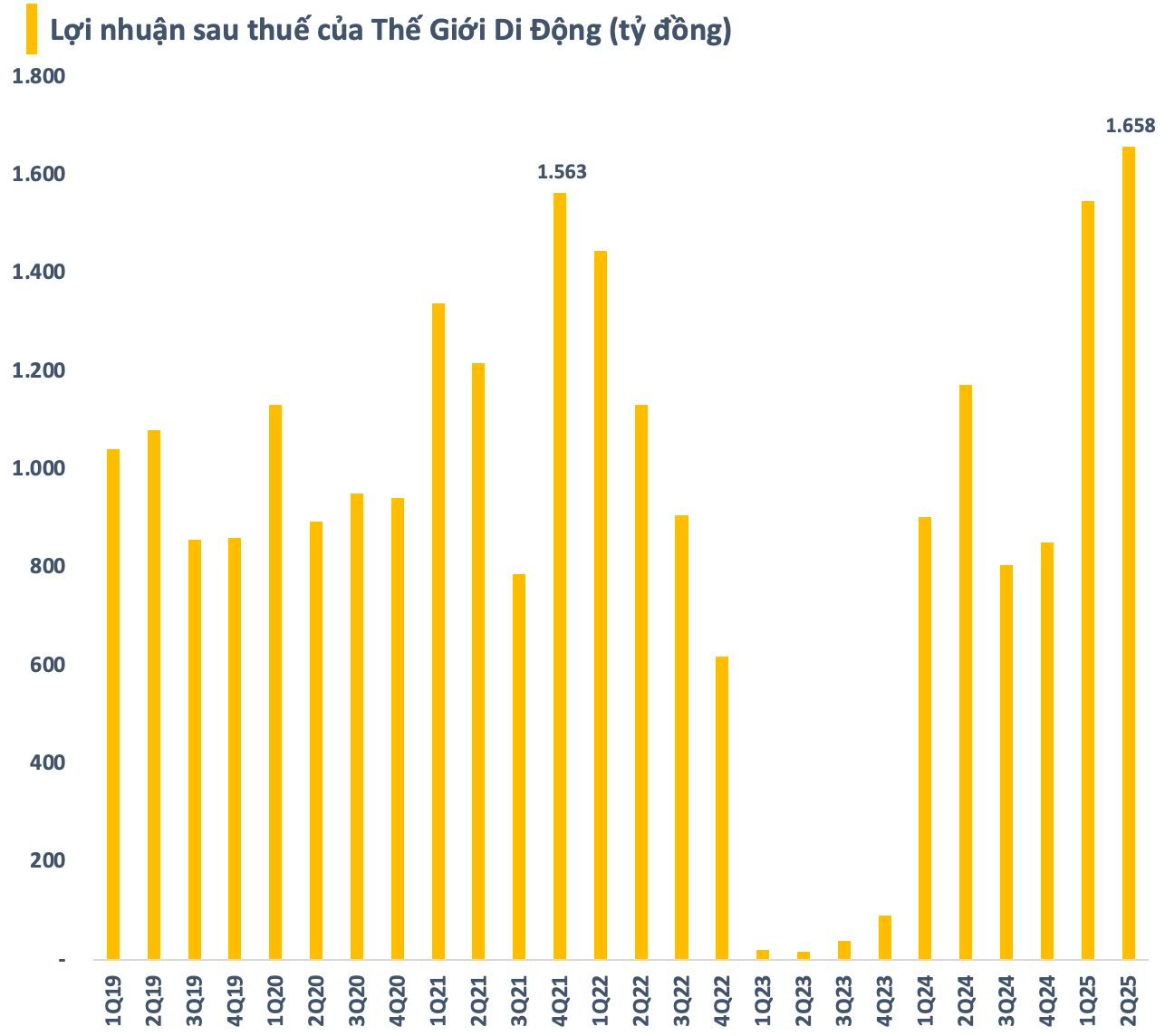 Quý 2/2025 với doanh thu thuần đạt 37.620 tỷ đồng, tăng hơn 10% so với cùng kỳ 2024. Sau khi trừ chi phí, MWG lãi sau thuế 1.658 tỷ đồng, tăng hơn 41% so với cùng kỳ năm ngoái. Đây là mức lợi nhuận cao kỷ lục mà doanh nghiệp bán lẻ của ông Nguyễn Đức Tài ghi nhận trong một quý kể từ khi hoạt động.