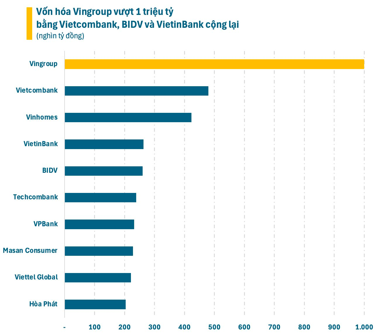 Đà tăng tốc ngoạn mục đã đưa vốn hóa Vingroup vượt mốc 1 triệu tỷ đồng, giúp tập đoàn trở thành doanh nghiệp Việt Nam đầu tiên đạt được cột mốc lịch sử này. Quy mô vốn hóa của Vingroup hiện gấp đôi Vietcombank – doanh nghiệp xếp thứ hai và thậm chí còn tương đương tổng vốn hóa của ba ngân hàng Vietcombank, BIDV và VietinBank cộng lại.