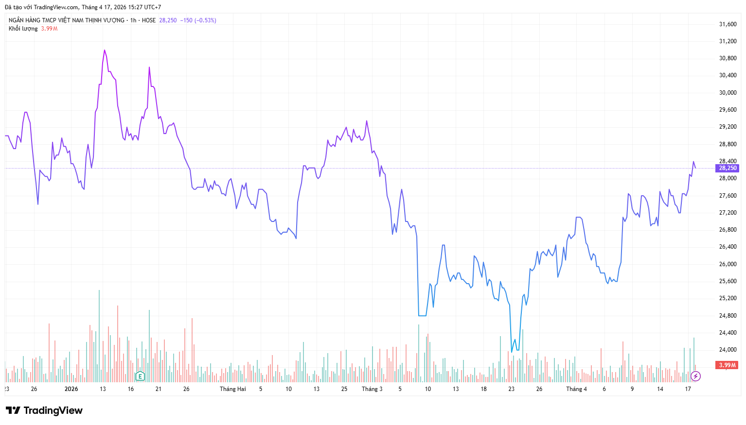 Kết thúc phiên giao dịch ngày 17/4, giá cổ phiếu VPB ở mức 28.250 đồng/cổ phiếu, tăng nhẹ 1,2% so với đầu năm.